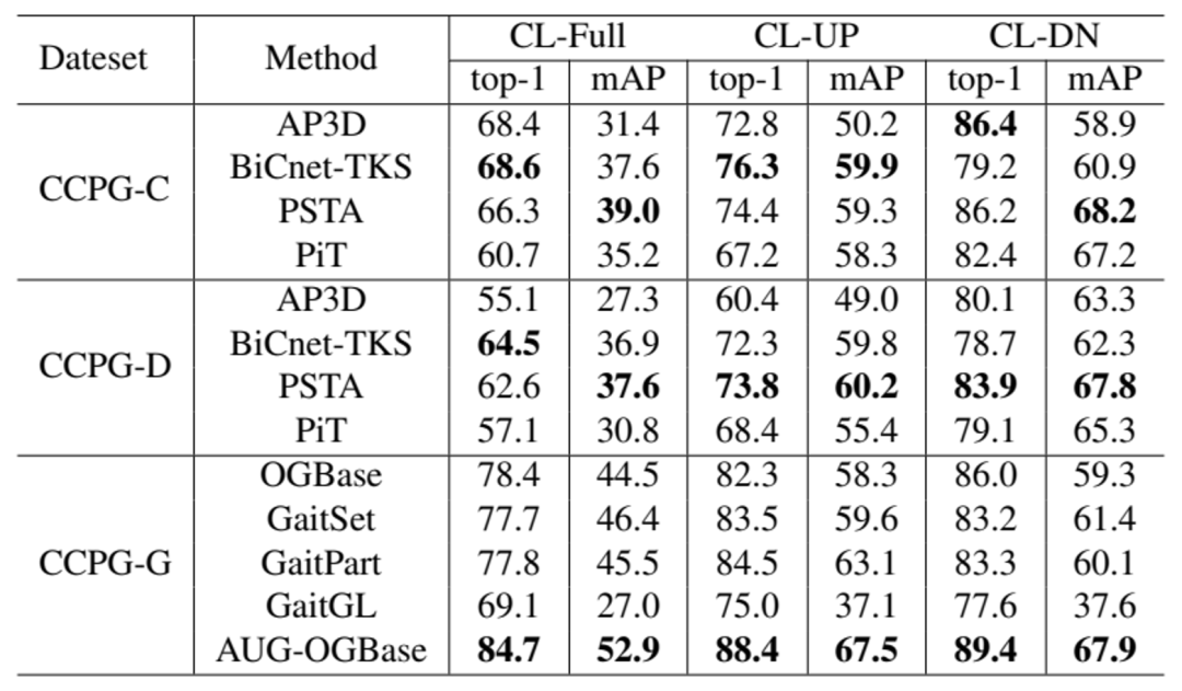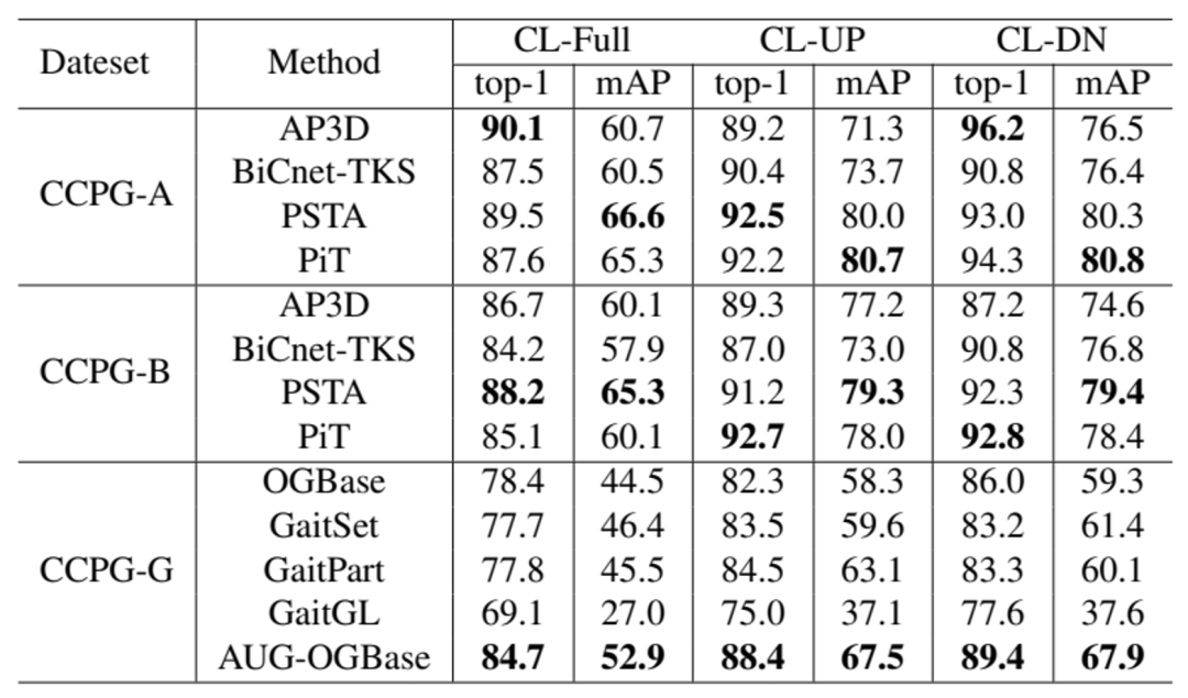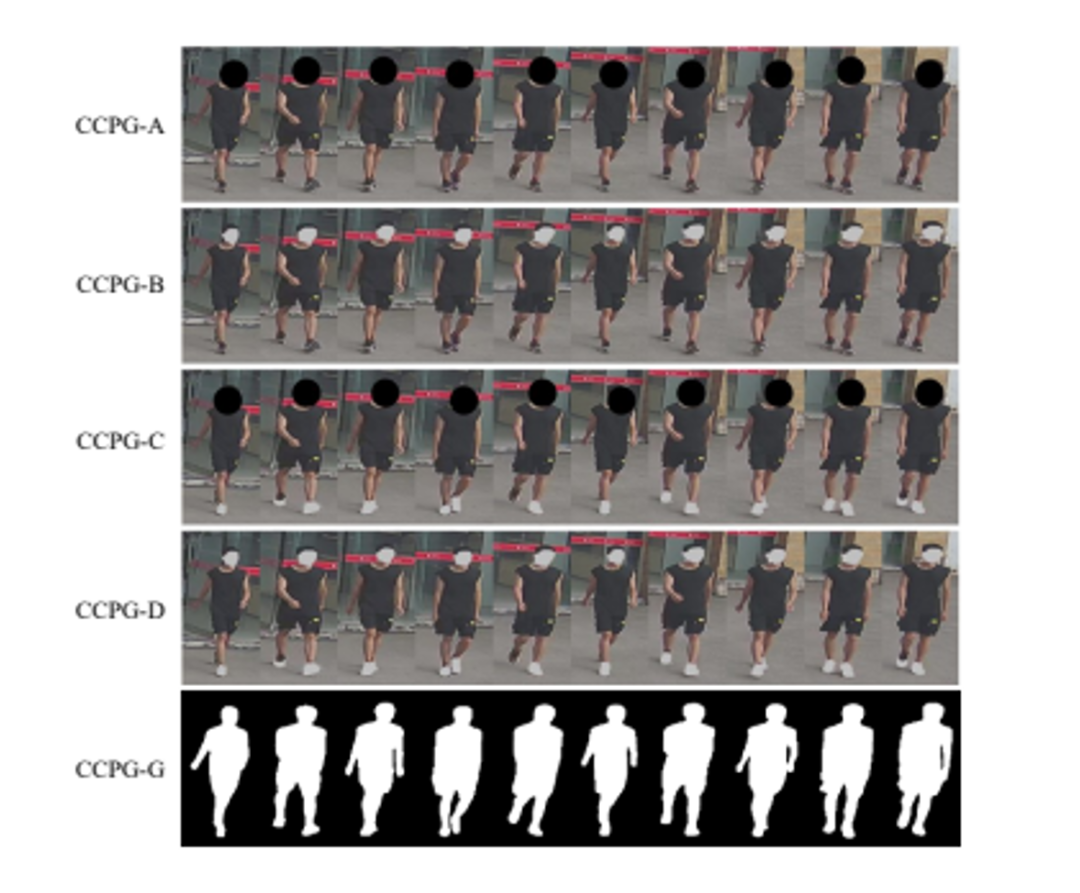 值得注意的是,我们还根据实战中鞋子区域与脸部区域信息的可得性,对这两个区域进行Mask的操作,得到了3个子数据集用于进一步的实验探索。最后我们使用CCPG数据集进行了一系列换装问题下行人重识别和步态识别方法的实验,证明步态识别在解决换装问题方面的优越性。另外,我们还提出的简单而高效的步态识别新方法AUG-OGBase在CCPG数据集取得令人满意的效果,进一步论证步态识别方法在解决换装问题中的潜力。