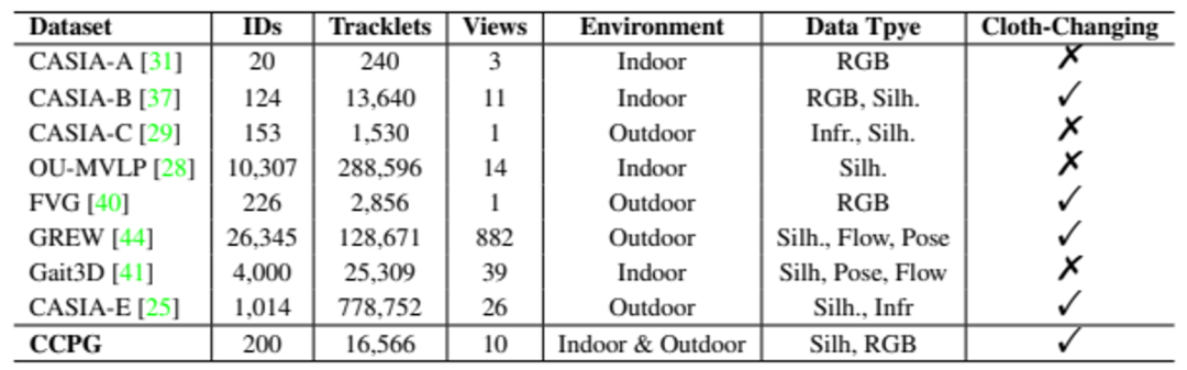 本文介绍了一项针对基于视频的行人重识别 (Person ReID) 和步态识别 (Gait Recognition) 技术的研究。这两项技术在视频监控分析中起着至关重要的作用,目标都是从不同的摄像头中识别目标行人。然而在实际应用中,换装的问题影响了它们的识别精度。当时鲜有工作研究此问题,究其原因是数据集的缺失。为了解决这个问题,我们提出了一个名为CCPG的基于视频的行人换装基准数据集,其中包含200个行人和超过16,000个行走序列。该数据集包括用于的RGB和剪影数据,包含了室内和室外场景下可能出现的各种换装情况,使其成为比较行人重识别和步态识别在换装条件下的Benchmark。相比于其他的数据集,本数据集的亮点是在换装类型和场景有着更为丰富的样本。