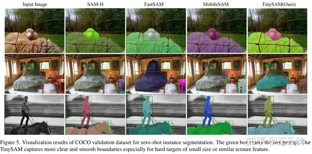 我们在多个zero-shot下游任务上进行了实验,包括在COCO和LVIS数据集的zero-shot实例分割实验,我们按照SAM论文的设置通过ViTDet得到的检测框作为Prompt输入到TinySAM模型中。相比MobileSAM,TinySAM在COCO的平均准确率提升0.9%,在LVIS的平均准确率能提升1.6%。即使采用8bit量化后,TinySAM仍然保持了性能优势。更多的实验结果和可视化结果请参考论文。