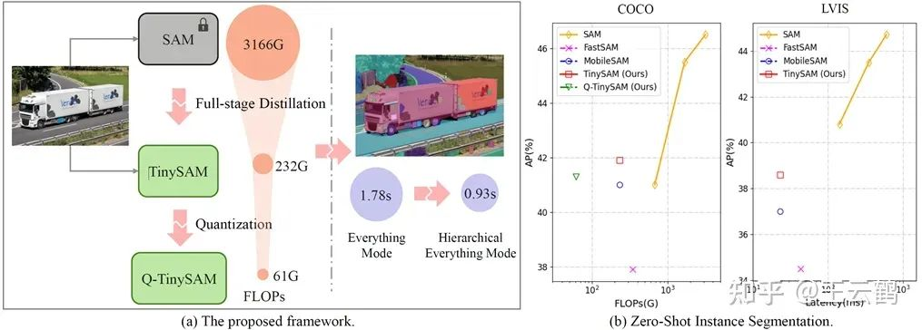 图1:(a)展示了TinySAM的框架,通过一种全阶段知识蒸馏、后量化和层次化推理加速方法,模型计算量可以降低到原来的1/50;(b)展示了模型在zero-shot下游分割任务上仍然保持了良好的性能。