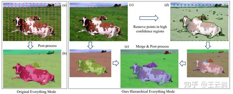 图3:我们设计的层次化分割一切推理模式,我们先用较少的采样点得到初始的结果,然后我们把高置信度区域的密集采样点移除,得到二次推理结果后通过后处理与初始结果融合得到最终的分层推理结果。