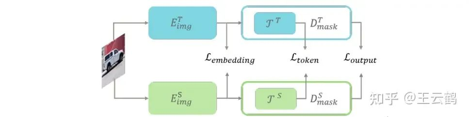 针对分割一切模型多模块、难优化的结构特点,我们提出一种全阶段的知识蒸馏方法,从多个特征层面进行蒸馏学习,从图像特征(embedding)、最终监督特征(mask)、中间过渡特征(token)三个层面进行蒸馏损失的设计,最大程度减少轻量化学生网络的学习难度。
