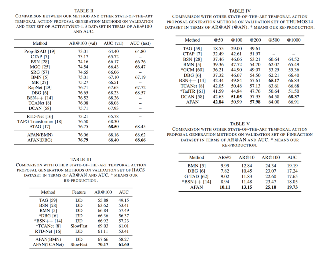 实验结果显示,我们的动作频率自适应方法能够有效提升现有时序动作提名生产方法。在ActivityNet-1.3数据集上,我们的模型AFAN(BMN)在验证集和测试集的AUC方面分别比基准方法BMN高出1.06%和1.43%。为了进一步验证我们方法的有效性,我们还基于先进的时序动作提名生成模型DBG进行实验验证。DBG同时生成起始、结束和动作置信度图以评估所有动作提议,与BMN相比,它可以生成更灵活的动作提议。由于具有更好的动作提议生成器DBG,我们的AFAN(DBG)在ActivityNet-1.3数据集上取得了更高的性能。