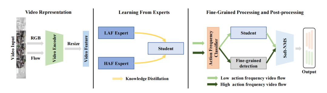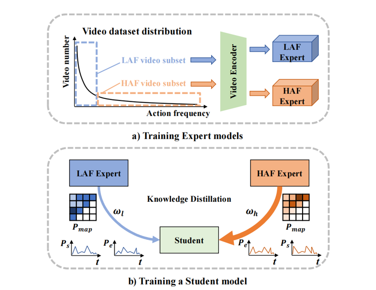 为解决上述问题,我们提出了一个动作频率自适应的时序动作提名生成框架。一方面,我们通过专家学习方式来减轻数据不平衡。具体来说,我们将整个视频数据集分成几个子集,每个子集具有较少不平衡的数据分布。通过这种方式,我们可以确保在这些子集上训练的专家模型在数据不平衡方面受到的影响较小。为了整合来自专家模型的知识,我们随后通过知识蒸馏训练一个统一的学生模型,该模型适应不同动作频率的视频。