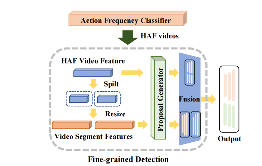 同时,我们设计了一个动作频率分类器来辨别高动作频率视频,再对其进行精细检测,提高短时动作的预测性能。我们的方法可以方便地应用在现有时间动作提议生成模型之上。我们在两个经典模型(BMN和DBG)上验证所提出的方法,并在四个基准数据集进行了性能评估。充分的实验结果证明了我们方法的有效性和通用性。