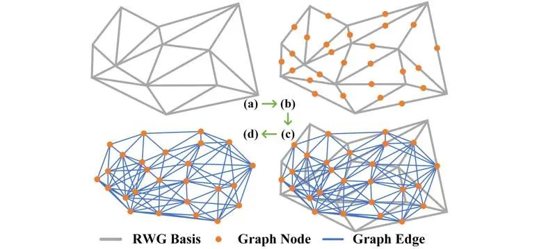 在三维建模中通常使用非均匀离散化来表示任意形状,相比卷积神经网络,图神经网络(GNN)可以更好地建模此类非结构数据。从三维目标的RWG基函数集构建一个图。将每个RWG基函数视为图中的一个节点,图中的边是通过连接图中的两个相邻节点形成的,确定两个节点是否相邻的原则是相应的RWG基函数是否共享一个公共端点。下图展示了GNN-MoM算法中图的构建方式