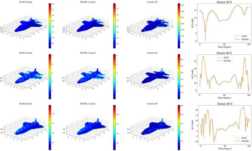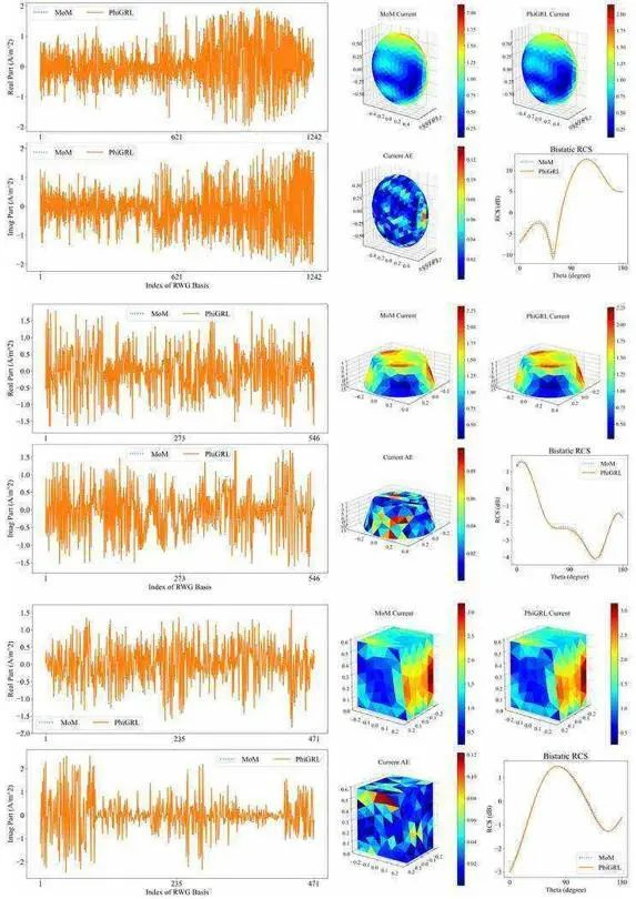 由MoM和GNN-MoM计算的表面电流及RCS,GNN-MoM预测的表面电流和RCS与MoM计算的结果有较好的吻合。