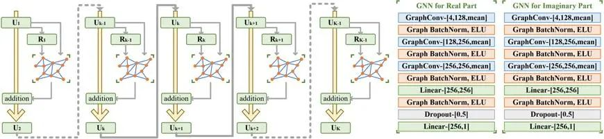 在基于残差学习的三维矩量法电磁建模中,构建两个结构相同、参数不同的GNN,分别学习u_k的实部和虚部的更新规则,方程求解中第 次更新可以写为