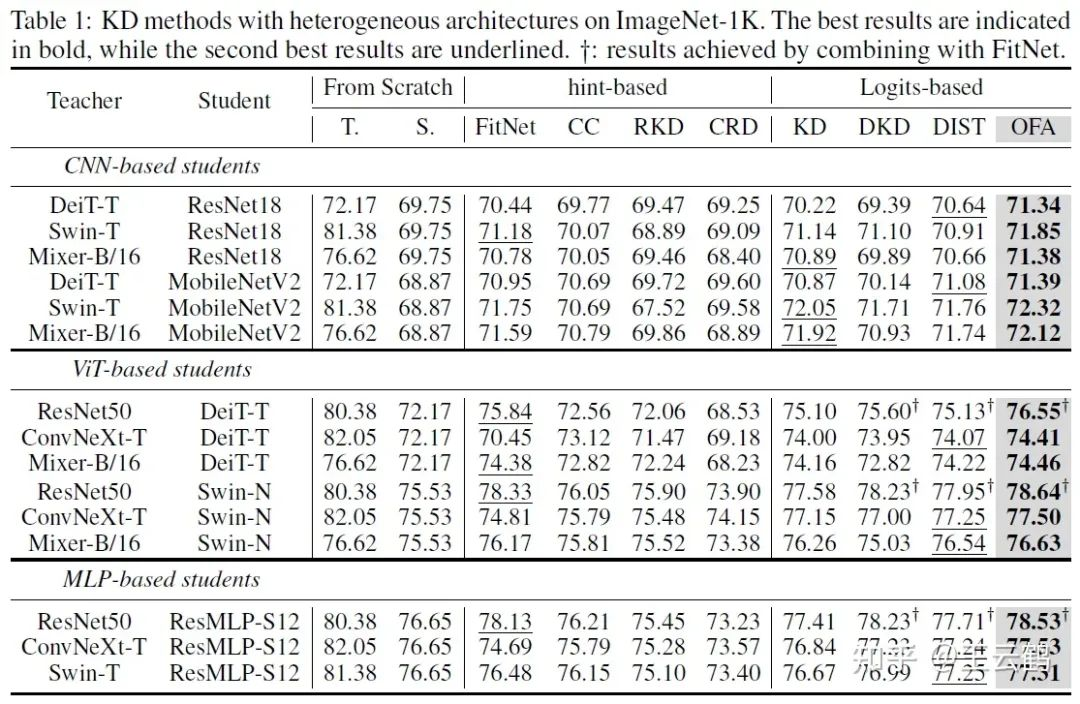 上表展示了在ImageNet上的异构蒸馏结果。在所有架构的六种可能异构组合中,本文OFAKD方法都得到了超越现有方法结果。