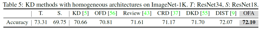本文在ImageNet上与传统同构模型蒸馏方法进行了对比。在常见的ResNet34和ResNet18同构教师学生模型组合上,OFAKD也具有与现有SOTA方法相当的表现。
