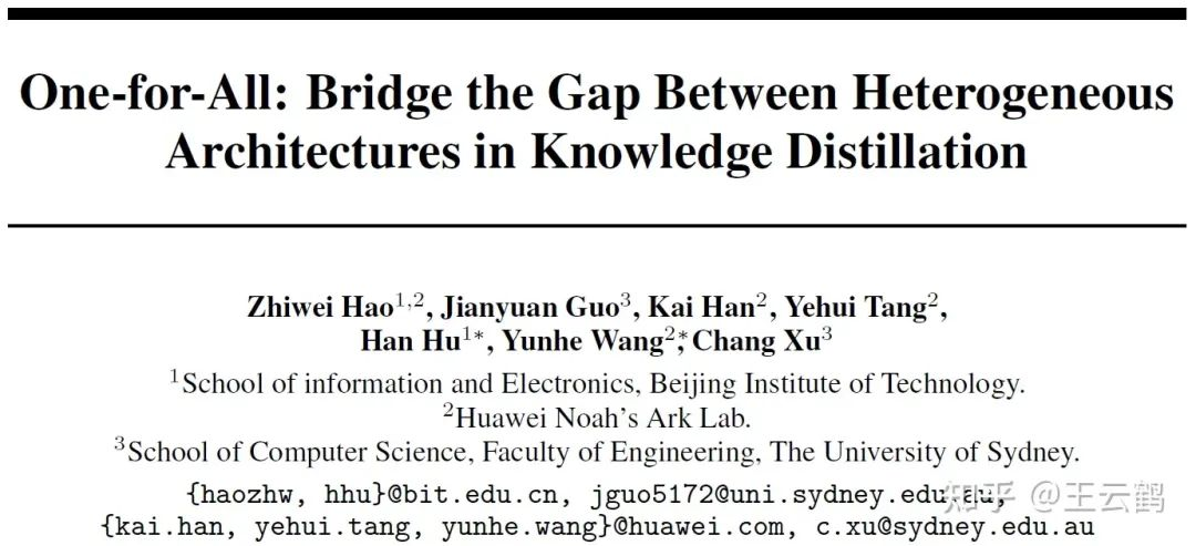 自知识蒸馏方法在2014年被首次提出以来,其开始广泛被应用于模型压缩领域。在更强大教师模型辅助监督信息的帮助下,学生模型往往能够实现比直接训练更高的精度。然而,现有的知识蒸馏相关研究只考虑了同架构模型的蒸馏方法,而忽略了教师模型与学生模型异构的情形。例如,最先进的MLP模型在ImageNet上仅能达到83%的精度,无法获取精度更高的同架构教师模型以使用知识蒸馏方法进一步提高MLP模型的精度。因此,对异构模型知识蒸馏的研究具有实际应用意义。