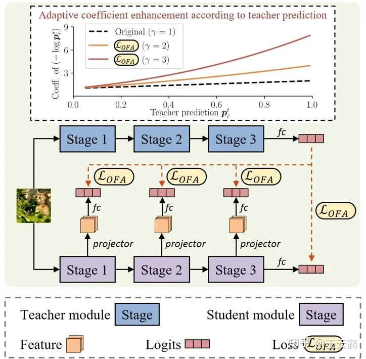 本文研究了异构模型之间的知识蒸馏方法,通过将学生模型中间层特征映射到logits空间来拟合教师模型最终输出,并使用在原始知识蒸馏损失函数基础上改进而来的自适应目标信息增强损失,提出的OFAKD方法在多种数据集和教师学生模型组合上实现了对现有方法的超越,扩展了知识蒸馏的应用范围。