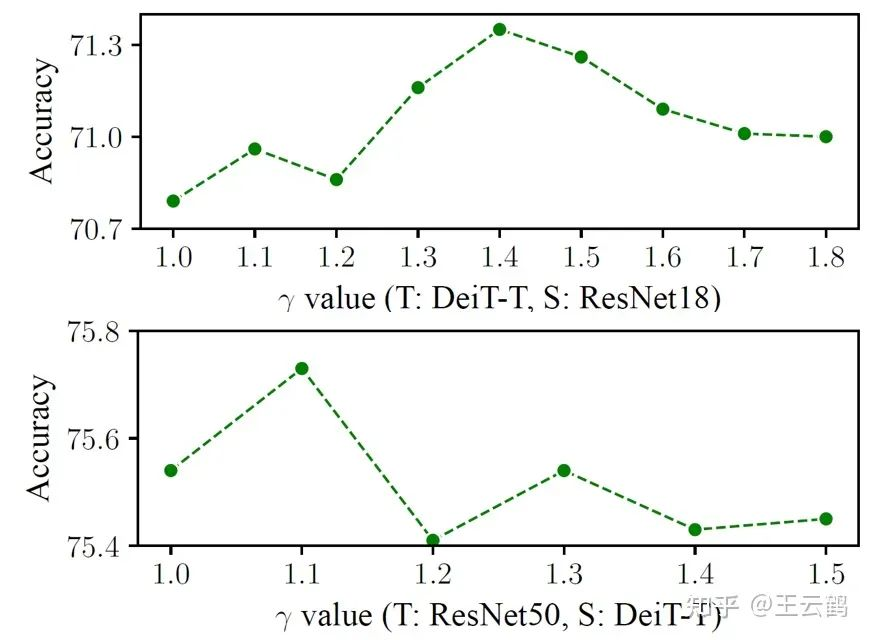 上表在ImageNet上比较了不同的值设置对结果的影响。可以看出,通过选取合适的值设置,改进后的蒸馏损失函数能得到超越原始蒸馏损失函数的结果。