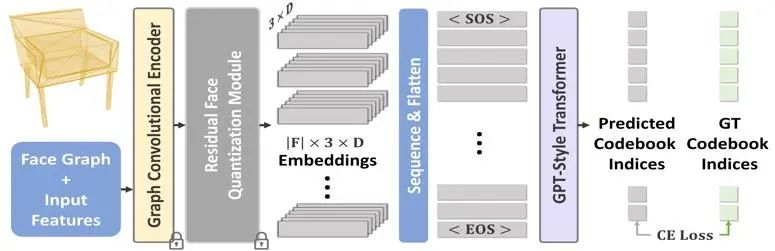 MeshGPT主要由两个网络组成。首先通过Encoder-Decoder架构,学习到经过残差量化的三角形embeddings。而后通过Decoder-only GPT,生成紧凑三角形网格。