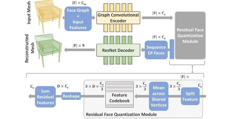 如果直接使用上一节生成的rich features作为embeddings,即每个网格面使用单个code,会造成重构精度不足的现象。因此,本案例参考了残差向量量化(Residual vector Quantization,RQ)[3]的方法,每个面使用D个codes(D为RQ的深度)来进行改善。