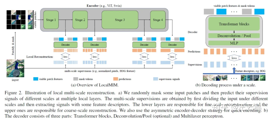 另一方面,视觉主干网络设计的很多工作已经表明从底层到高层特征图的尺度由粗到细对各种视觉任务(检测,分割和分类)都有增益,通常较低层学习细粒度的信息而较高层学习粗粒度的信息。为此,我们不妨从原始输入中构造多尺度的监督信号(选择不同的p)来分别用于多个局部层的重构,令较低层重构细尺度的监督信号而较高层重构粗尺度的监督信号。值得注意的是,我们的方法与“加速编码”方法兼容,特别的我们采用MAE和GreenMIM中的做法,即编码器只输入可见patch。算法的整体流程如图2(a)所示。图2(b)中演示了某一特定尺度下的解码过程,解码器由三部分组成:推理部分(transformer blocks)+缩放部分(Deconvolution/Pool)+预测部分(MLP)。推理部分负责基于可见patch的表征推理被遮挡patch的信息;缩放部分是处理特征尺度与监督信号尺度不一致的情况,比如ViT这种柱状结构每层特征尺度不变而监督信号尺度是变化的,当不匹配时需要使用反卷积或池化操作进行上/下采样;预测部分负责整合放缩后的预测来作为最终输出。对于金字塔结构的模型,通常已经划分为多个stage,我们将重构任务用于每个stage的末端,对于柱状架构,我们参照金字塔架构的经验,选择部分层进行重构。