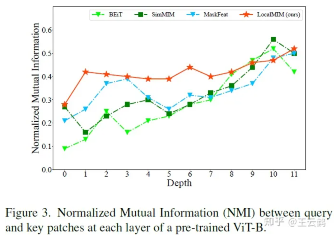 较高的NMI值意味着注意力强烈地依赖于query patch,如图3所示已有的很多经典模型(BeiT,SimMIM和MaskFeat)在较低层的注意力并不像顶层一样强烈地依赖于query patch。