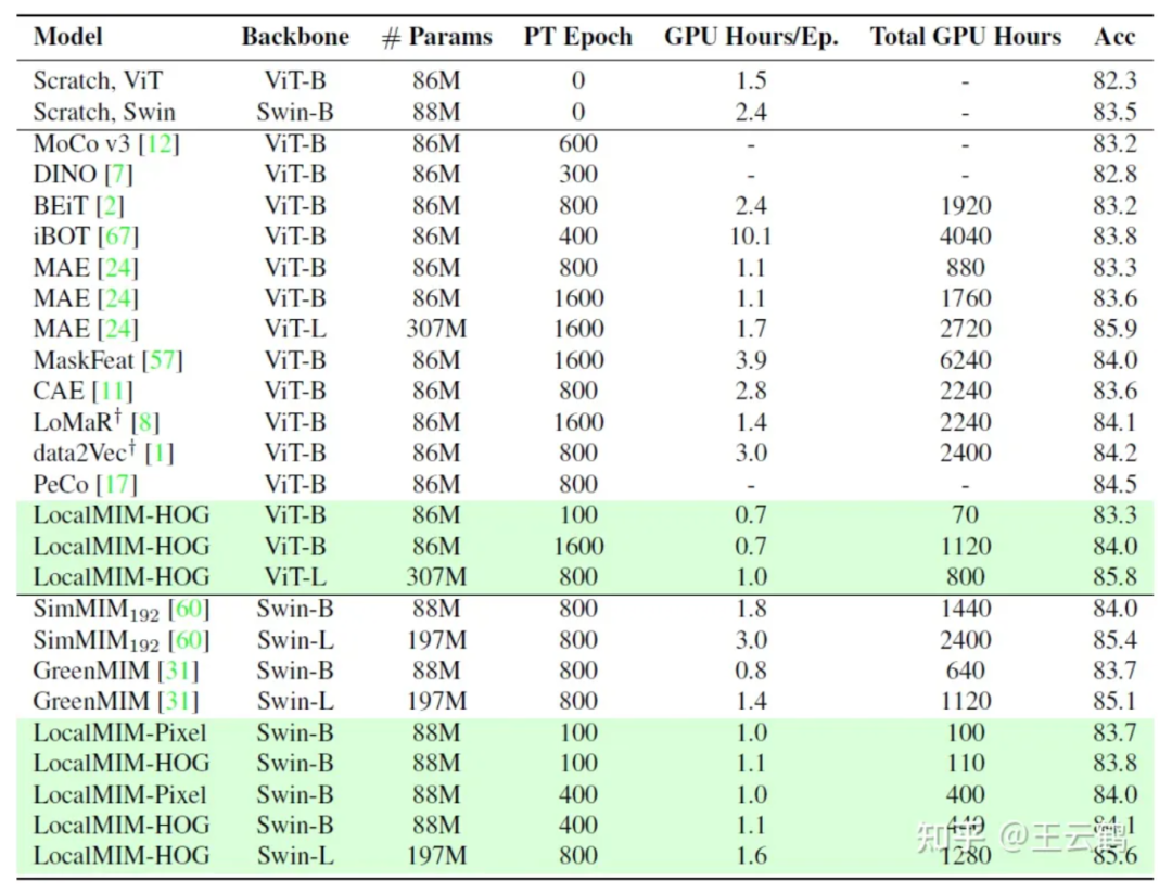 从表1中可以看到,LocalMIM比已有模型显著更加高效。具体的,就ImageNet-1K上top-1微调准确率而言,LocalMIM分别以3.1倍和5.6倍的加速达到MAE和MaskFeat的最佳表现,以3.6倍和6.4倍的加速达到SimMIM192和GreenMIM的最佳表现。相较于其他模型,LocalMIM也以显著更少的预训练时长实现了可比较的表现。从表2和3中可以看到,在下游的检测及分割任务上,LocalMIM以显著更少的计算成本获得更优的表现。更多的消融实验及实施细节可见论文。