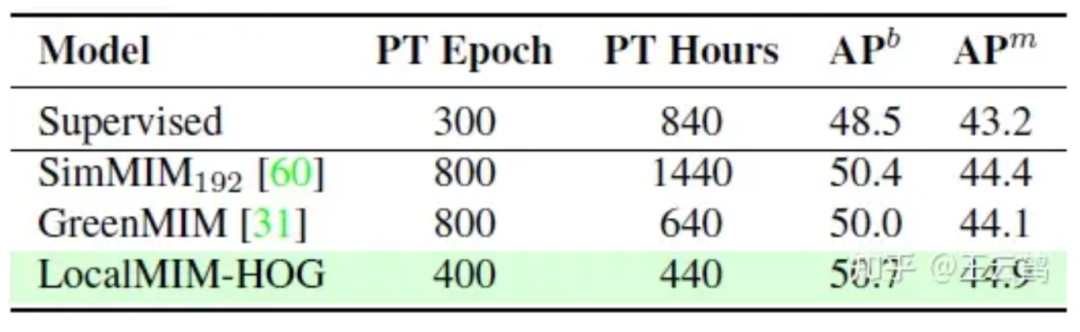 我们目前在柱状架构ViT以及金字塔架构Swin上验证LocalMIM的有效性,考察其在分类、检测以及分割中的表现,如表1,2和3所示。出于其简单性,我们只考察像素标准化和HOG两种特征描述算子。