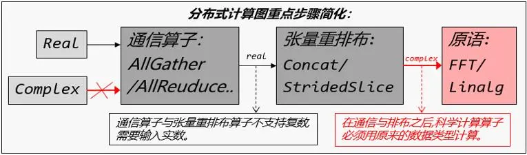 在分布式过程中,通信算子是必要的。由于当前主流通信算子不支持复数数据类型,导致应用科学计算算子的上层模型可能无法进行模型并行,模型的大小和推理的效率都可能受到影响。