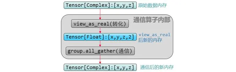 算子缺少支持类型,最直接的思路自然是使算子支持,也就是使通信算子和重排布算子本身添加复数类型的支持。这看似是最简单的方案,但是在已经构建好的框架中,为某个算子添加一种框架中未定义的类型支持,首先需要考虑框架本身对于该种类型的支持,就可能需要在整个框架的各处进行修改。如Nvidia通信库NCCL实际上也是不支持复数的。HCCL也无法支持复数,添加对复数的支持除了直观的工作之外至少还需要考虑以下问题:在通信库中添加类型支持是否是合适且合理的改动?添加复数的支持是否会影响对于已有实数的支持,给实数的场景带来额外开销?此外,对于张量重排布中涉及到的其他算子,是否也要进行算子级别的修改?在考虑复数类型支持的问题时,必须考虑到,复数属于个别应用场景,对于通常的AI训练情况下不具有普适性。