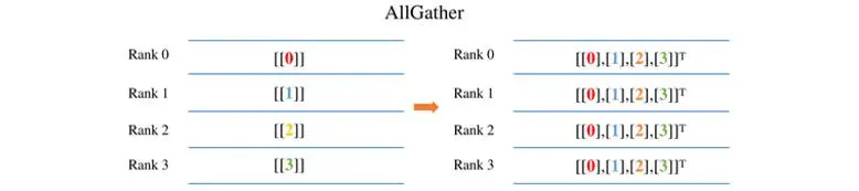 2)AllGather: 将每张卡的输入Tensor的第零维度上进行拼接,最终每张卡输出是相同的数值。