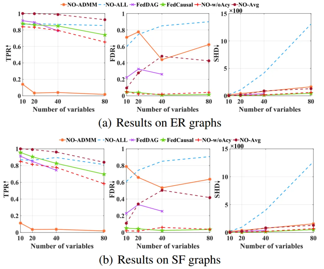本文分别在同质和异质数据分布两种场景下进行实验,每种场景都设置10个客户端,每个客户端包含200个样本,共2000个样本。因果图规模包括10,20,40,80四种设置。评估指标包括发现的图结构包含的边相比于真实图结构包含的边的真正率(TPR)、错误发现率(FDR)以及结构汉明距离(SHD)。通过与最先进的分布式或联邦因果发现方法进行对比,分析证明本文所提出算法的优越性。