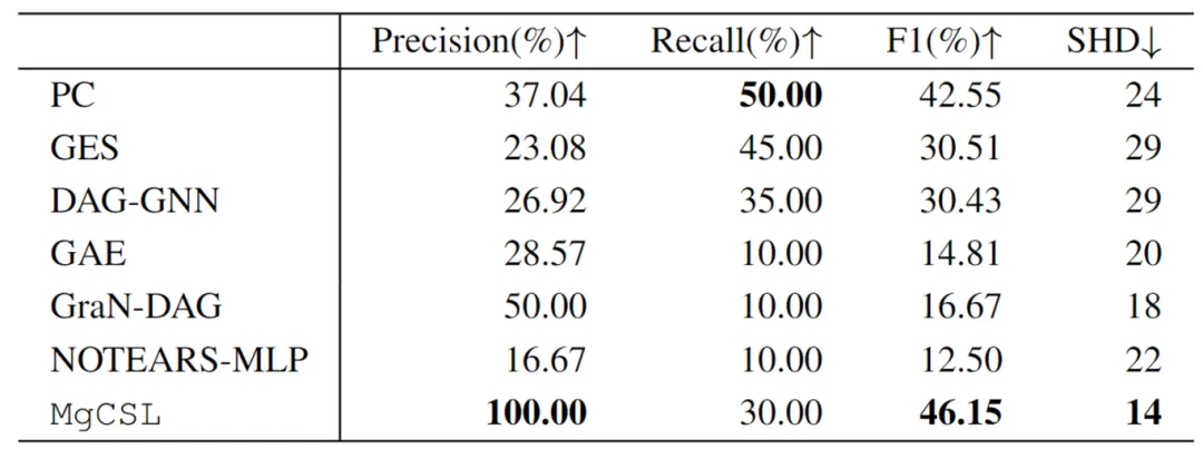 为了进一步验证MgCSL的有效性,本文在Sachs的蛋白质信号数据集上进行了实验。表2中的结果显示,与基线相比,MgCSL仍然表现出了具有竞争力的性能,在准确率、F1 和 SHD 方面均超过了基线,并识别出了6条正确的因果边。这标志着其在实际应用中具有明显的潜力。