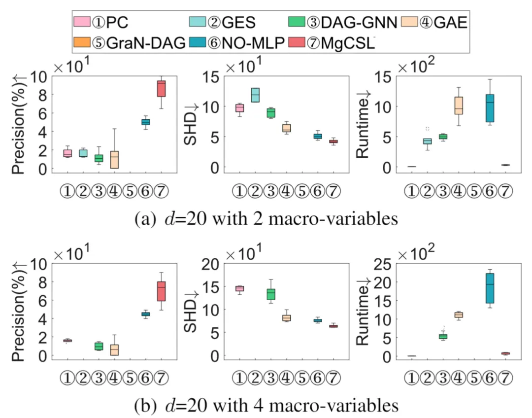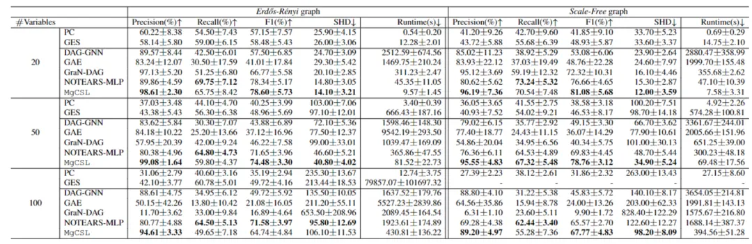 本文也在典型的因果发现合成数据集上进行了实验。如表1所示,MgCSL在大多数指标上都超过了基线,即使在高维图上,其准确率仍然很高。此外,简化的无环惩罚使MgCSL能够在更短的时间内提供有效的结果,确保其在实际应用中的可行性。