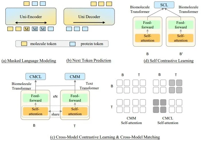 (c)跨模态对比学习(CMLM)和跨模态匹配(CMM)是专门为跨模态整合定义的两种表示学习方法,首次出现在BLIP2中。这两种训练方法的区别在于自注意力机制的不同关注方式。具体来说,在CMM中,生物分子标记(B)和文本标记(T)互相关注,而在CMCL中,B和T只关注各自的标记。