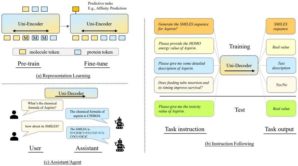 (c) 一个重要的目标是使模型能够在生物分子领域作为智能助手或代理人,并能够与用户进行交互并进行对话以帮助解决用户的问题。这种聊天机器人需要模型通过有效的跨模态整合方法对生物分子和文本具有深入的知识。