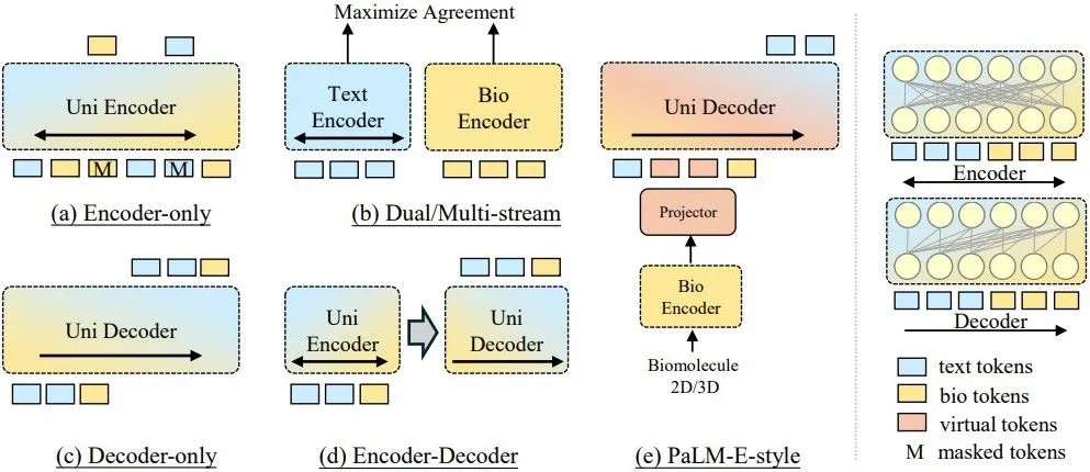 不同学习框架下的模型架构包括:单编码器和单解码器模型,通用的编码器-解码器(encoder-decoder)结构,双/多流框架,以及层次化集成生物分子编码器和单解码器的模型。这些模型旨在实现多模态神经网络、图神经网络和基于Transformer的模型,用于处理文本和生物分子数据。