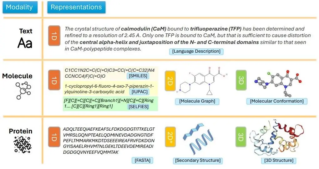 多模态表示的复杂性:整合生物分子和自然语言的多模态表示需要考虑不同数据源的特点和维度,需要设计合适的表示学习方法以捕捉不同模态之间的关联。