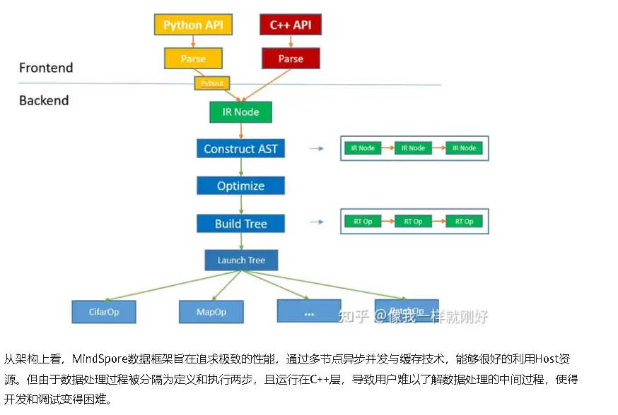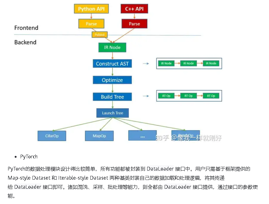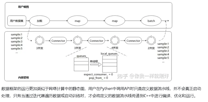 但相反,由于操作的过度封装,用户无法精细地调控整个处理过程,一旦需要添加某种框架不具备的能力,只能通过修改自定义逻辑来实现,使得自定义数据集代码往往庞大而臃肿。并且整个处理过程都同步执行,一旦处理逻辑比较复杂,性能将会很差,虽然可以通过DataLoader的多进程并发提高处理速度,但由于并行的粒度为整个处理流程,无法只调节某个节点,使得资源的消耗将会更大。