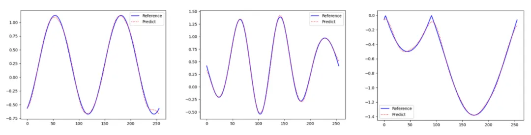 在这个任务中,我们所采用的方程形式分布仍与预训练数据集相同,而需要恢复的对象是其中对应于方程源项的系数场s(x)。对于每个PDE,我们假设能够获取100个不同的初始条件下的解,可观测到的样本点局限于32个固定的空间位置,平均每个空间位置能获取32个观测样本。这些点的观测值上会添加相对幅度为1%的噪声,而作为PDEformer-1输入的初值上添加3%的噪声。相应的优化问题使用梯度下降算法求解。下图展示了 PDEformer-1 在反问题中的应用,我们用红色曲线代表恢复结果,蓝色曲线代表真实值,对于三个不同的测试样例,两个图像之间均未见明显偏差,反演的精度较高。