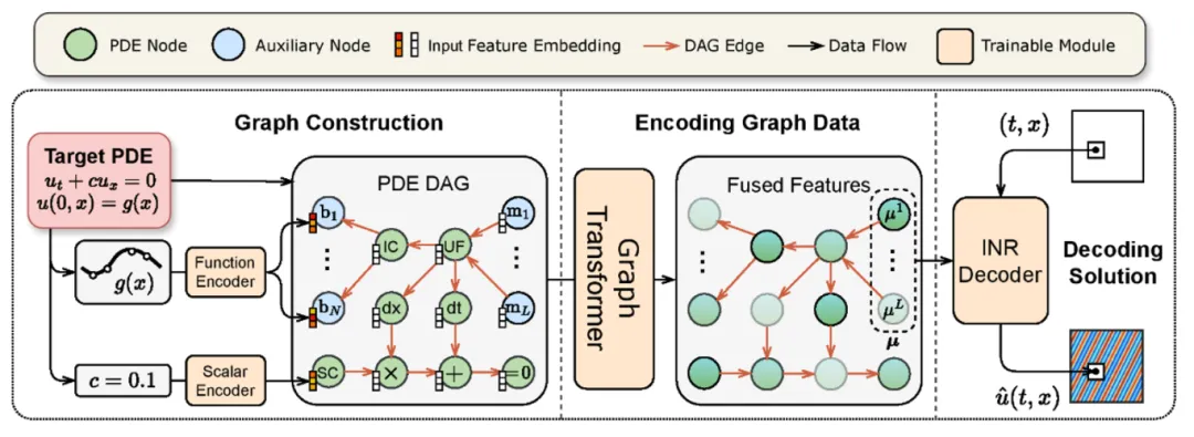 图 1 以具有周期边界条件的对流方程(单分量)为例。在求解PDE的过程中,PDEformer-1先将方程形式表示为一个计算图,接下来应用Graph Transformer ,将PDE有关的数值信息进行编码,最后将编码结果输入一个INR ,从而得到PDE在特定时间-空间坐标下的解。