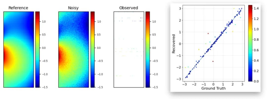 下图展示了 PDEformer-1 结合PSO算法达到的出色反演效果。其中,左侧三幅图分别为真实数据、噪声数据、观测到的数据,右侧为真实系数及恢复值的情况。我们用散点绘出求解结果,可以看出,恢复的系数与真实值非常接近,散点主要分布在y=x线上。一些异常值的存在可以归因于这个反问题本质上的病态性。