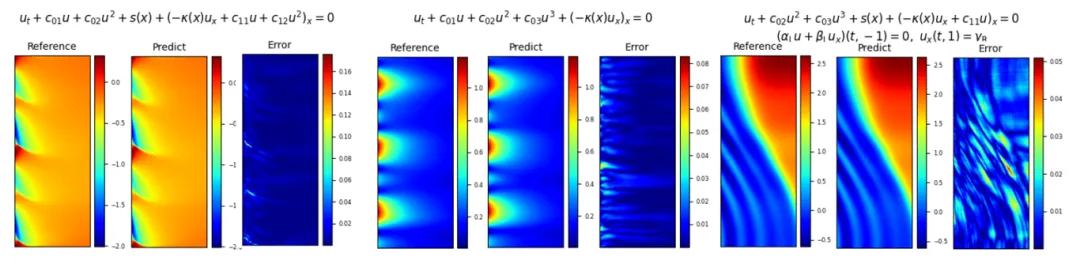 图3 PDEformer-1 在训练数据集中的部分样本上的推理效果(横轴为时间分量,纵轴为空间分量)