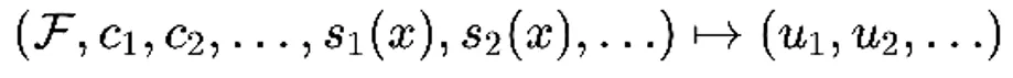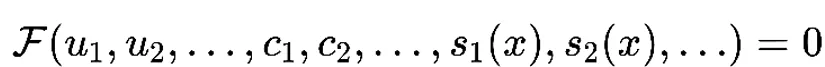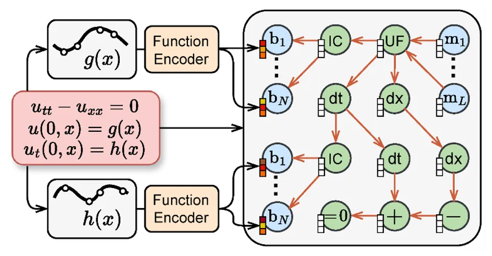 其中,c_1, c_2, …∈R是实值系数,s_1(x), s_2(x)…是标量函数(在方程中可作为初始条件、系数场等),u_1, u_2…为待求解的物理场的各个分量。在这里,微分或边界条件算子F具有符号表达式,其中可能涉及微分和代数运算。PDEformer-1的目标是构建一个方程解的代理模型,形式为: