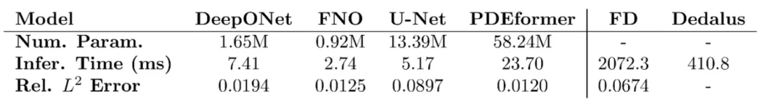 我们还从推理速度的角度将PDEformer-1与专家模型及传统数值解法进行了比较,结果如下图所示。PDEformer-1与传统数值解法相比,具有量级上的优势,而与机器学习中的专家模型相比,并没有特别显著的差距。