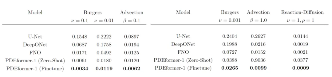 可以看出,在与预训练集设定相同的数据集上,PDEformer-1能够达到出色的求解效果。