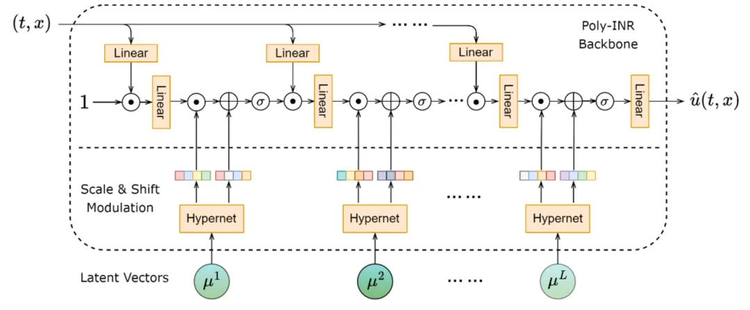 PDEformer-1 采用 INR(隐式神经表示)方式来表示方程解的各个分量。这一网络以时空坐标 (t,x)作为输入,并根据隐编码μ_j来预测出相应的方程解分量在该坐标点的取值uhat_j(t, x)。通过这种方式给出的预测不依赖于特定的离散网格。在具体实现时,PDEformer-1选用了Poly-INR架构,并做了相应的适配(见下图)。Poly-INR的隐层数目为L,其中第l个隐层的激活值将被μ_j^l “调制”。注意PDE中的所有的分量共享同一套INR的参数,它们仅仅是对应的隐编码μ_j有所不同。