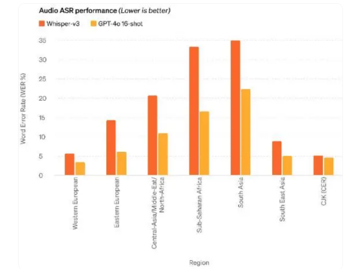 在音频方面,GPT-4o 的语音识别(ASR)也比 OpenAI 的语音识别模型 Whisper 性能更佳(越低越好)。