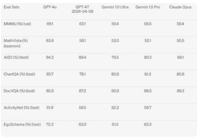 更重要的是,GPT-4o 的视觉理解能力在相关基准上取得了压倒性的胜利。