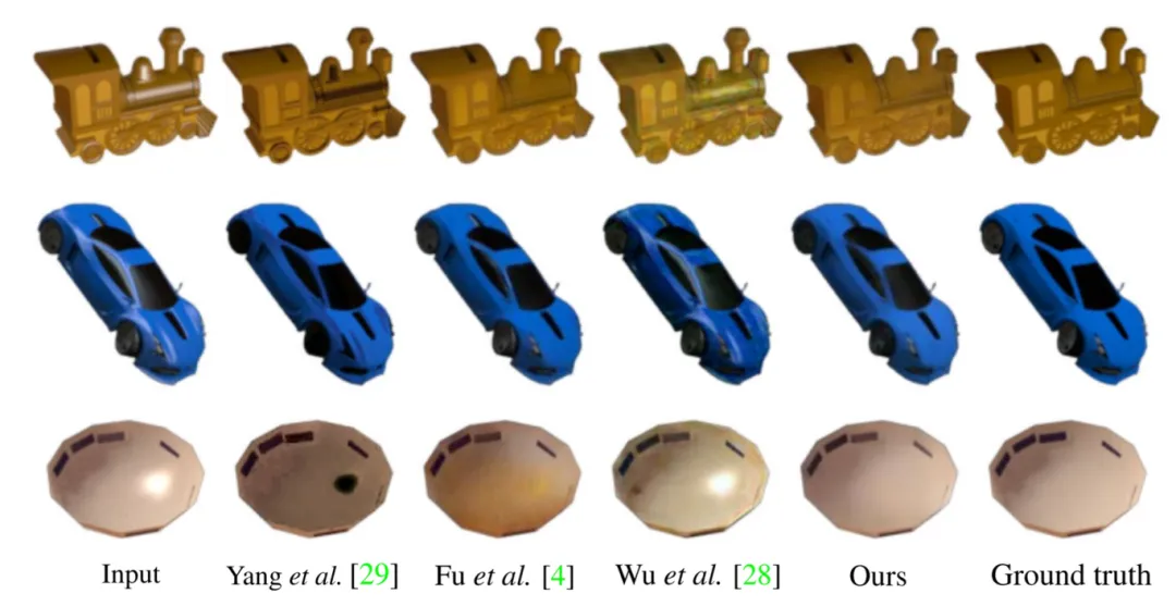 为了支持这一框架的训练和评估,本文构建了一个大规模的合成数据集,如图2所示。该数据集包括多种物体和光照条件,每个数据样本都包含反射率、明暗图、镜面高光残差、无镜面高光的真实标签图。利用该数据集,网络可以在有监督的环境下学习如何有效消除镜面高光,同时保证图像质量。