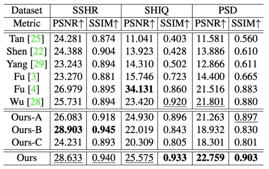 表 1. 在SSSH、SHIQ和PSD数据集上的定量比较结果