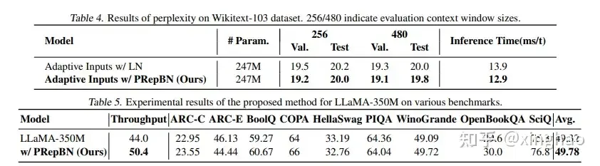 我们基于Adaptive inputs方法在Wikitext-103数据集上评测了PRepBN在语言任务的能力。同时,我们也将PRepBN应用在了LlaMA-350M模型中,并评测了模型在下游任务的性能。从实验结果可以看出,我们的PRepBN方法在语言任务上也表现出了不错的性能,精度无损的情况下将LLaMA-350M速度从44tokens/s提升到了50.4tokens/s。