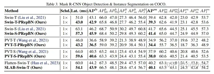 我们在ImageNet1k数据集上进行了实验,实验结果证明在多个backbone上,我们的PRepBN均获得了与LN相当甚至更好的性能。从实验结果看,相当基于LN的模型,PRepBN模型的分类精度有0.1%~1.4%的提升。而基于我们SLAB的模型,能在精度与Flatten Transformer相当的情况下,减少模型的推理的时延。