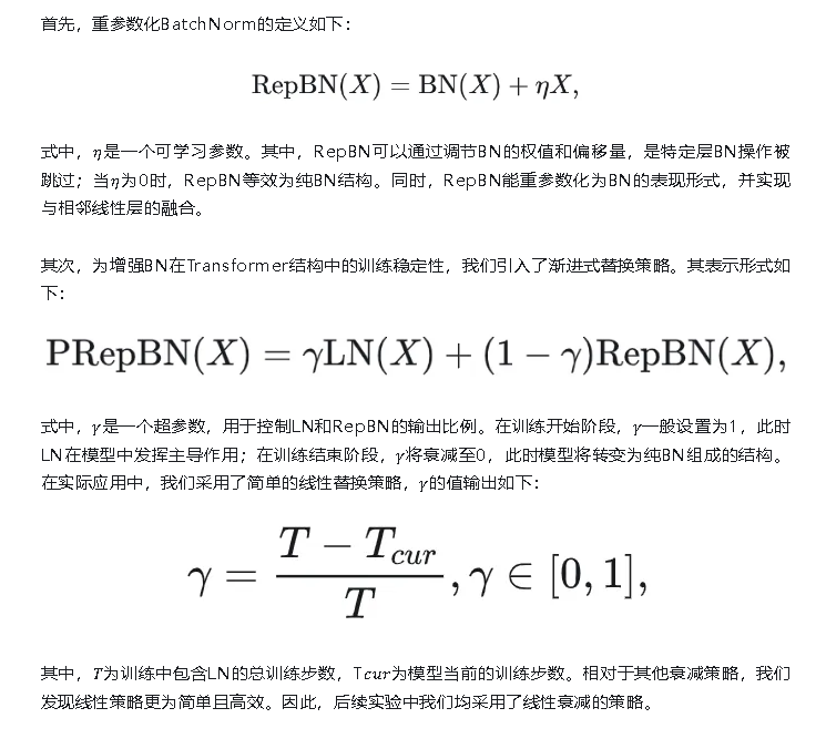 LN作为Transformer中常用的标准化层结构,由于其在训练和推理两阶段均存在均值和方差的计算,影响了Transformer的执行速度。与之相对,BN仅在训练阶段存在均值和方差的计算,且在推理阶段可与相邻的线性层融合,可以去除标准化层对模型推理速度的影响。但是,在Transformer结构中将LN简单替换为BN训练会导致模型精度下降以及训练崩溃等问题。为解决这个问题,我们对BN进行了优化,并提出了渐进式重参数化BatchNorm策略。