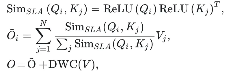 Attention是Transformer网络中重要的模块之一。为进一步压缩模型计算量,我们引入了线性注意力模块。在该模块中,我们仅使用了硬件亲和的ReLU算子作为相似度函数,并增加了一个深度可分离模块增强局部特征提取。该简单线性注意力模块(simplified linear attention, SLA)形式如下: